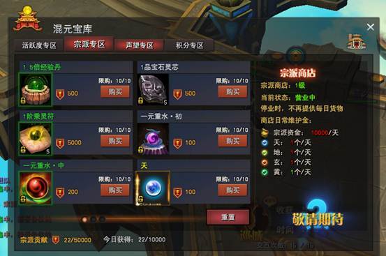 宗派商店进行正常营业,需要消耗日常维护金,当宗派的日常维护金足够时,宗派中的玩家便可从宗派中兑换材料奖励。同时,宗派商店等级越高,可兑换的奖励就越丰富。