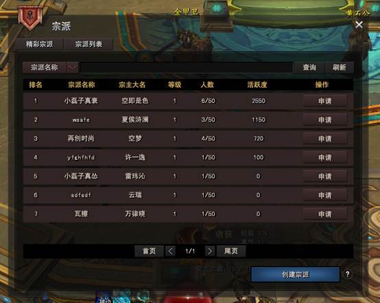 玩家点击“创建/加入宗派”按钮后,会将页面跳转到宗派列表界面中,玩家可以在这个界面中查看其他玩家创建的宗派,并可申请加入其中。