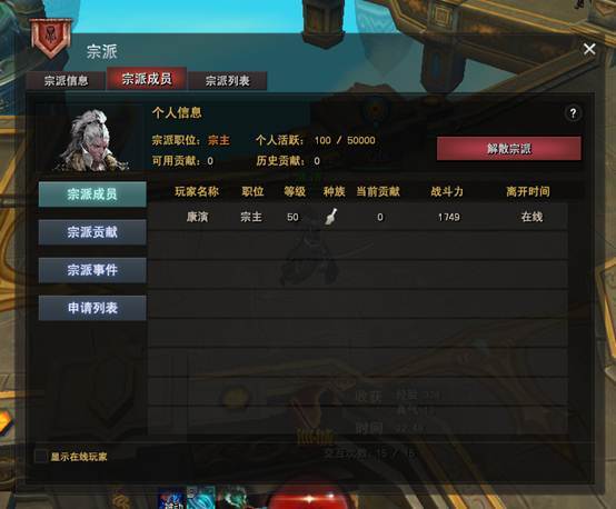 在宗派成员界面中,玩家可以查看自己的个人信息,并可通过宗派成员分列表查看自己宗派的成员。