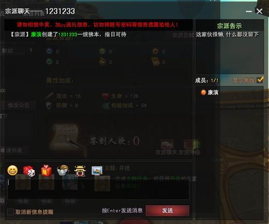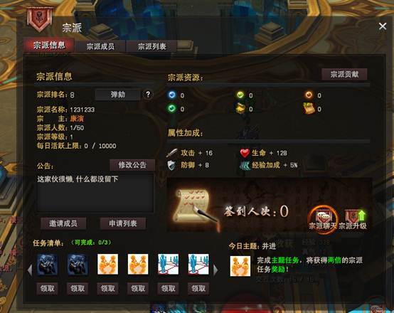 加入宗派之后,玩家就可以打开宗派信息界面了,在这个界面中玩家可以查看自己当前的宗派信息,修改宗派公告,进行宗派签到,