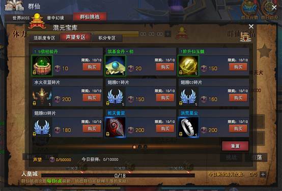 通过挑战群仙可获得声望,在群仙界面当中可打开声望商店,进行声望购物。