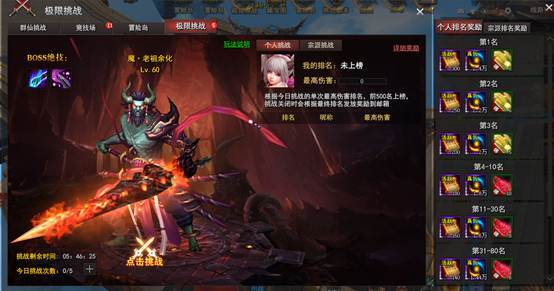 每周一、三、五、六8点开启,23点关闭,同时刷新伤害排行榜,并根据排名发放个人奖励到邮箱。每天0点刷新,如果当天未开启则不显示挑战页签